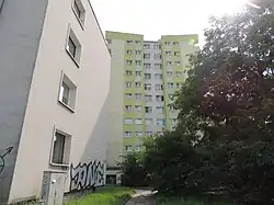 - ↑ W górniej części zdjęcia widoczne osiedle Huby: część na której zbudowano osiedle mieszkaniowe „Huby” i po prawej część budowaną później między ulicą Kamienną a aleją Armii Krajowej. Wyróżniają się widoczne wzdłuż ulicy Borowskiej trzy dominujące punktowce (typu punktowiec przy ulicy Jastrzębiej), dalej w centralnej części osiedla dwunastokondygnacyjne bloki mieszkalne ulica Wesoła 37, 39, 41 oraz ulica Przestrzenna 32, 34 i 36 oraz nieco po prawej w górnej części trzy punktowce w rejonie skrzyżowania ulicy Hubskiej z ulicą Kamienną.
