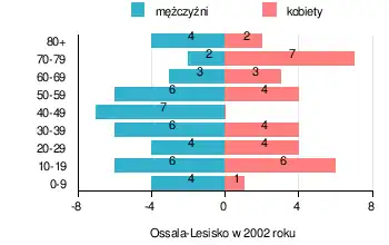 Współczesna struktura demograficzna wioski Ossala-Lesisko na podstawie danych z lat 1995–2009 według roczników GUS-u, z prezentacją danych z 2002 roku[7]: