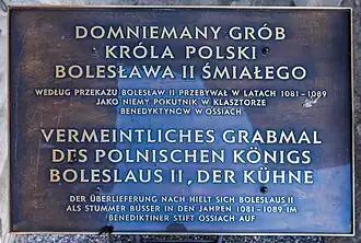 Drugim opatem klasztoru był Teuzo, z którym związana jest legenda o polskim królu Bolesławie Szczodrym. Legenda głosi, że po zamordowaniu biskupa Stanisława polski król Bolesław II Szczodry żył w klasztorze Ossiach nierozpoznany jako „cichy pokutnik” i przyznał się opatow, że jest królem dopiero na łożu śmierci. Ta wersja z ucieczką do Karyntii pojawiła się wśród historyków polskich w XV wieku. Nie jest jasne czy Bolesław faktycznie mieszkał w Ossiach. Jego rzekomy grób znajduje się na północnej ścianie kościoła. Otwarcie grobu i dalsze prace wykopaliskowe w XIX i XX wieku nie były w stanie zapewnić tutaj żadnej jasności. Pomnik nagrobny od XVI wieku był obiektem kultu króla Bolesława, zwłaszcza wśród polskich pielgrzymów. W 1856 roku cesarz Franciszek Józef I złożył wieniec na domniemanym grobie. W 1905 roku Ziemia Koronna Galicji i Lodomerii podarowała kolegiacie witraże w emporach organowych. W 1945 r. polscy żołnierze wznieśli kamień pamiątkowy. Badania wykonane w latach 50. XX wieku pod kierownictwem Karoliny Lanckorońskiej udowodniły jednak ahistoryczność tej legendy, ponieważ w grobowcu uważanym za miejsce spoczynku króla Bolesława znaleziono resztki zwłok Irinburgi, żony fundatora opactwa.
