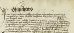 - ↑ „Dominus dux ratione servitiorum (…) donavit ius Stiborio de Osthasewo et pueris eius, videlicet quia absolvit kmethones in portione ipsius in Osthasewo districtus Czechanoviensis a laboribus castrorum antiquorum, novis castris exceptis (…)”, AGAD: Metryka Koronna (Mazowiecka) nr 4, k. 32 v.