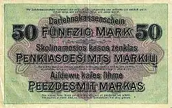 Niemiecka administracja okupacyjna, zwana potocznie Ober-Ost (Gebiet des Oberbefehlshabers Ost), została utworzona w 1915 r., po wyparciu wojsk rosyjskich z terenów guberni grodzieńskiej, kowieńskiej, kurlandzkiej, suwalskiej i wileńskiej. Początkowo na tych terenach władze okupacyjne wprowadziły do obiegu ostrubla, który miał wyprzeć pozostającego w obiegu rubla rosyjskiego (1916). Emitentem była Wschodnia Kasa Pożyczkowa, Darlehnskasse Ost, będąca agendą niemieckiego Banku Wschodniego Handlu i Rzemiosła z siedzibą w Poznaniu. Po usamodzielnieniu się Wschodniej Kasy Pożyczkowej ustanowiono jej siedzibą Kowno, gdzie w kwietniu 1918[1] wyemitowano banknoty przeznaczone do obiegu na terenach Ober-Ost. Do obiegu wprowadzono banknoty o następujących nominałach[2]:
