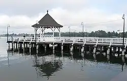 ![]() Panorama wybrzeża jeziora w Ostródzie z rozpoznawalnymi wieżami kościołów ewangelickiego i katolickiego | |||||
