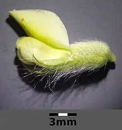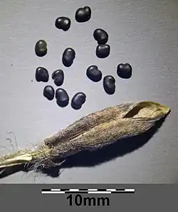 - Podługowaty, na szczycie zaostrzony, czarny i odstająco owłosiony strąk.