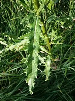 - Liście wydłużone, o bardzo zmiennym kształcie: od wrębnych, aż po sieczne, kolczaste. Z wierzchu zielone i nagie, pod spodem szarawe z kutnerowatym nalotem. Dolne na krótkich ogonkach, pozostałe siedzące. Siewka — łodyżka podliścieniowa jest krótka, naga barwy biało-zielonej. Liścienie odwrotnie jajowate lub owalne wydłużone, na obu końcach zaokrąglone osadzone na nagich zielonych, krótkich ogonkach. Siewka jest rozetą ze skrętolegle ułożonymi liścieniami i liśćmi. Pierwsze liście jajowate kolejne coraz bardziej wydłużone na szczycie i u nasady zwężające się, na brzegach ząbkowane kolczaste. Blaszki liściowe pod spodem popielate z powodu gęstego pajęczynowatego owłosienia[7].