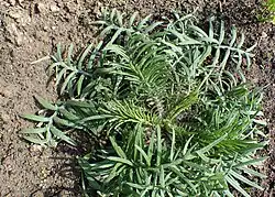 - Ulistnienie skrętoległe. Liście pierzastosieczne, na górnej stronie obficie kolczasto owłosione, na dolnej kutnerowate. Odcinki dolne całobrzegie, górne karbowane, z kolcami. Posiadają w środku bardzo gruby nerw[5][6].