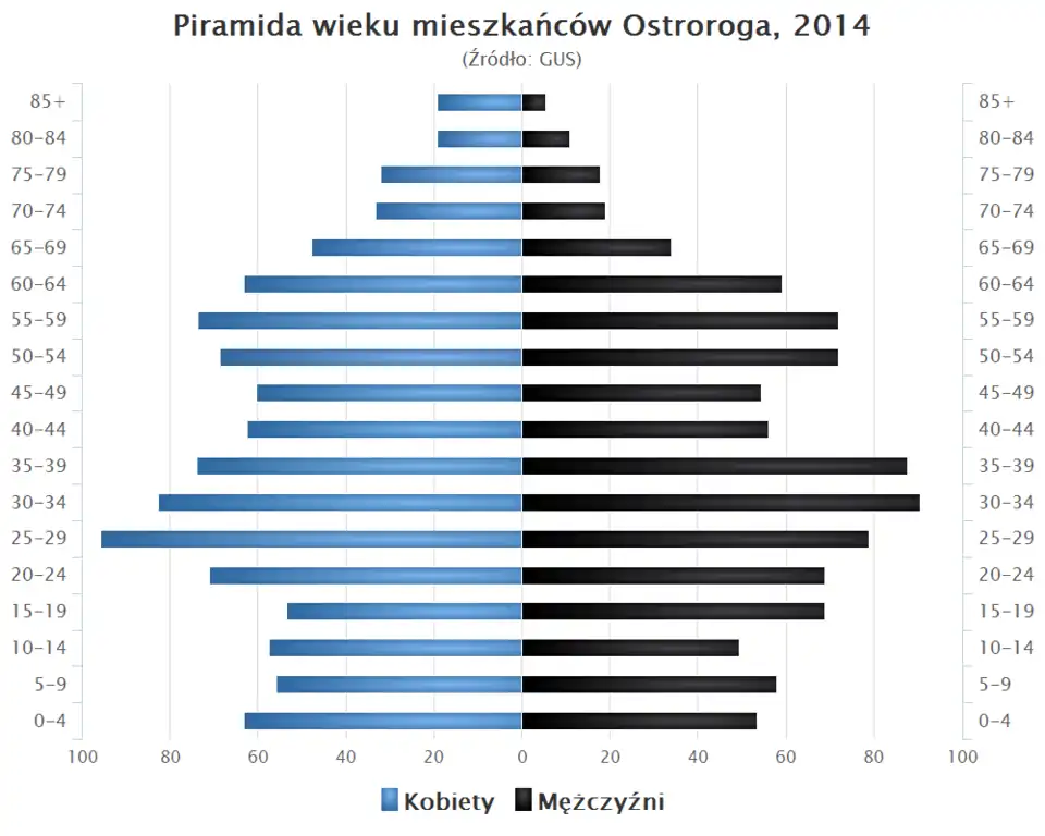 - Piramida wieku mieszkańców Ostroroga w 2014 roku[2]: