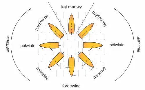 Jacht znajduje się w półwietrze lewego halsu. Aby wyostrzyć do bajdewindu, sternik wychyla płetwę sterową w lewo powodując skręcanie jachtu.