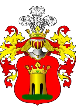 W czerwonym polu – na zielonym pagórku – brama złota ukoronowana o dwóch drzwiach – nad nią korona królewska – nad hełmem w koronie – trzy pióra strusie.