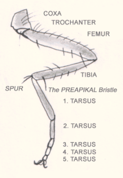 | A – głowa, B – tułów, C – odwłok 1. czułek 2. ocelli dolne 3. ocelli górne (trzecie oko) 4. oko złożone (z fasetek) 5. zwój nadgardzielowy (mózg) 6. segment początkowy 7. arteria główna 8. układ kapilar oddechowych z tchawkami 9. segment środkowy 10. segment końcowy 11. skrzydło przednie (lub pokrywa skrzydłowa) 12. skrzydło tylne 13. jelito 14. serce 15. jajnik | 16. jelito tylne 17. odcinek odbytowy 18. pochwa 19. łańcuszek nerwowy 20. cewki Malpighiego 21. poduszka 22. pazurki 23. stopa 24. goleń 25. udo 26. krętarz 27. wole 28. zwój nerwowy tułowiowy 29. biodro 30. gruczoł ślinowy 31. zwój okołogardzielowy 32. aparat gębowy |