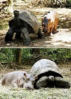 Roczny hipopotam nilowy nazwany Owenem został dostarczony do Haller Park 27 grudnia 2004, po tsunami, wywołanym przez trzęsienie ziemi. Prawdopodobnie stado hipopotamów żerowało w okolicach ujścia rzeki Sadaki i młody osobnik został porwany przez fale i wyrzucony na rafę koralową. Został schwytany w sieci przez mieszkańców Malindi. Wyczerpany i odwodniony, został umieszczony w jednej zagrodzie ze 130-letnim żółwiem olbrzymim Mzee (Mzee w suahili oznacza starca). Szary kolor skorupy żółwia oraz jej okrągły kształt mógł przypominać Owenowi dorosłego hipopotama. Zwierzęta stały się nierozłączne, razem jadły i spały, stanowiąc atrakcję parku. Opiekunowie zwierząt zaobserwowali, że wykształciły one specyficzny sposób komunikacji. Owen przejawiał część zachowań bardziej charakterystycznych dla żółwi, niż hipopotamów – był aktywny w ciągu dnia, a nie nocą. Chętniej jadł liście i marchew, niż trawę, która jest typowym pożywieniem hipopotamów.