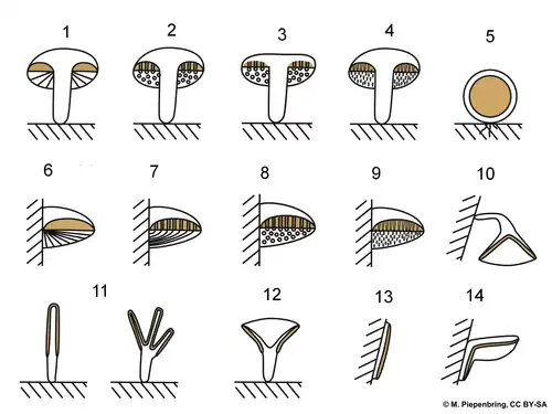 1 – kapeluszowy blaszkowaty, 2 – kapeluszowy rurkowaty, 3 – polyporoidalny, 4 – kapeluszowy kolczasty, 5 – zamknięty, 6,7 – hubiasty blaszkowy, 8 – hubiasty polyporoidalny, 9 – hubiasty kolczasty, 10 – cyfelloidalny, 11 – klawarioidalny, 12 – kantarelloidalny, 13 – rozpostarty, 14 – rozpostarto-odgięty