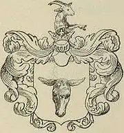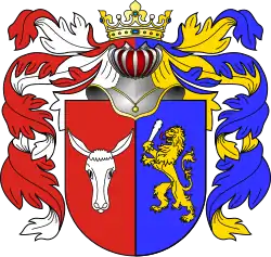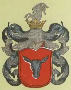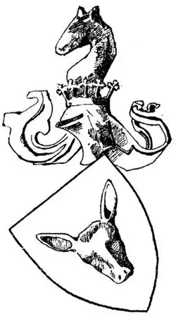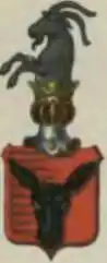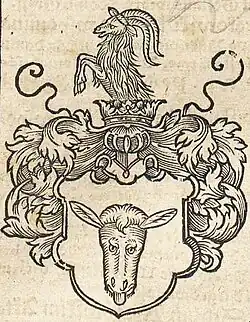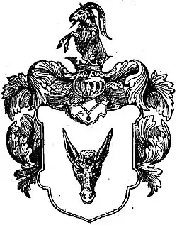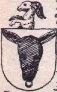 Głowa ośla szara, powinna być w polu czerwonem, na hełmie z korony pół Kozy, w prawą tarczy skierowanej głową wyskakuje, takt że nogi u niej przednie do góry zadarte, rogi na grzbiet złożone, tak go opisują.