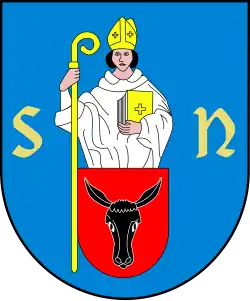 Na tarczy w polu czerwonym głowa ośla wprost, srebrna.