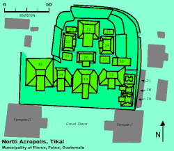 Ruiny Akropolu Północnego znajdują się w centrum Tikál przy Wielkim Placu[1]. Skrywają pozostałości stu budowli wznoszonych jedna na drugiej[2] na przestrzeni 1500 lat[3]. Większość z nich pochodzi z wczesnego okresu klasycznego[4].