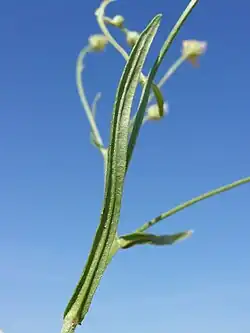 - Dolne skupione w rozetę przyziemną, zasychają w czasie kwitnienia. Są one ogonkowe (ogonek jest oskrzydlony)[6], pierzastodzielne i zatokowo ząbkowane[8]. Osiągają od kilku do kilkunastu cm długości i od 1 do 4 cm szerokości[6][9]. Liście łodygowe z wyjątkiem najniższych z reguły niepodzielone, coraz węższe i całobrzegie. Najwyższe równowąskie, długie i z reguły z brzegami podwiniętymi, siedzące i strzałkowatą nasadą obejmujące łodygę[8].
