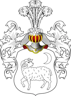 W polu baran kroczący, głową odwrócony w lewo, nad którego grzbietem półksiężyc w prawo. Klejnot: nad hełmem w zawoju trzy pióra strusie. Labry. Barwy nieznane.