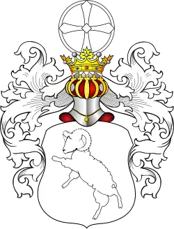 W polu zwierzę (baran? ryś?) wspięte. Klejnot: nad hełmem w koronie nieokreślone godło (jakby krzyż równoramienny wpisany w okrąg). Labry. Barwy nieznane.