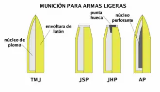 - z wgłębieniem wierzchołkowym JHP (ang. jacketed hollow-point) – pocisk z okrytym dnem posiadający wydrążenie w części czołowej (amunicja dum-dum)