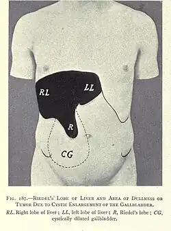- ↑ Riedel BM. Ueber den zungenförmigen Fortsatz des rechten Leberlappens und seine pathognostische Bedeutung für die Erkrankung der Gallenblase nebst Bemerkungen über Gallensteinoperationen. „Berliner klinische Wochenschrift”. 25, s. 577-581, 602-607, 1888.