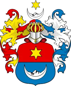 Na tarczy dzielonej w pas w polu górnym, czerwonym, gwiazda złota, w polu dolnym, błękitnym, półksiężyc z twarzą (okiem w prawo) srebrny. Klejnot: nad hełmem bez korony półksiężyc z gwiazdą jak w godle. Labry z prawej czerwone, podbite złotem, z lewej błękitne, podbite srebrem.