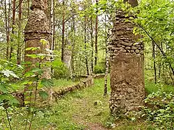 Dużą atrakcją są pozostałości kamienno-betonowego kręgu z kolumnami na obwodzie, połączonymi niegdyś grubym łańcuchem, oraz stojącą pośrodku podstawą pomnika, na którym według opowiadań miejscowej ludności, stał posąg marszałka Hindenburga o wysokości 5 metrów. Po odzyskaniu przez Polskę niepodległości, przestano dbać o ogród wraz z kamienno-betonowym kręgiem i ulegał on stopniowej degradacji. W młodniku na północ od kościoła znajdują się pozostałości po kręgu, kolumnach oraz podstawa, na której stał wspomniany pomnik[7].