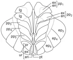- nieprzykryte[4] – płycej lub głębiej pofałdowana powierzchnia wymiany gazowej zajmująca znaczącą część grzbietowej ściany egzopoditu[3][4].