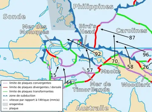 Płyta Ptasiej Głowy od zachodu i północnego zachodu graniczy z płytą sundajską, od północy z płytami filipińską i karolińską, od wschodu i z płytą Maoke, od południowego wschodu z płytą australijską, od południa z płytą Morza Banda i od południowego zachodu z płytą Morza Moluckiego. Granicą z płytą karolińską jest Rów Nowogwinejski.