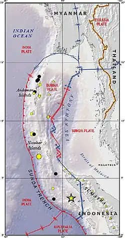 26 grudnia 2004 na granicy między płytą birmańską i indoaustralijską nastąpiło przesunięcie na odcinku o długości blisko 1200 km. Przesunięcie pionowe na granicznym uskoku tektonicznym wyniosło około 15 metrów. Trzęsienie ziemi, którego magnituda osiągnęła 9,0 stopni, wywołało przesunięcie znacznego obszaru dna oceanicznego oraz fale tsunami, które zabiły ponad 150 tys. osób na wybrzeżach Oceanu Indyjskiego.