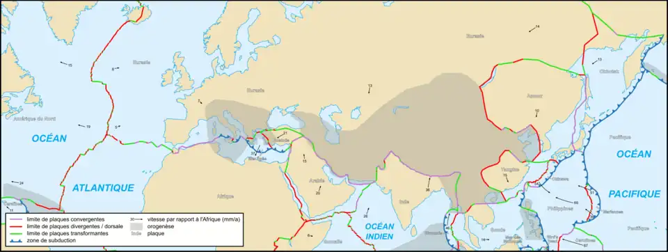 Od wschodu, zachodu i północy płyta eurazjatycka graniczy z płytą północnoamerykańską. Na zachodzie i północy granica ta ma charakter granicy rozbieżnej, na której uformował się Grzbiet Śródatlantycki i Grzbiet Gakkela. Natomiast na wschodzie jest to granica zbieżna – płyta północnoamerykańska i niewielka płyta filipińska wciągane są pod płytę eurazjatycką w strefach subdukcji. Jej południową granicę z płytami afrykańską, arabską i indoaustralijską wyznacza ciągnący się na długości kilkunastu tysięcy kilometrów łańcuch alpejsko-himalajski.