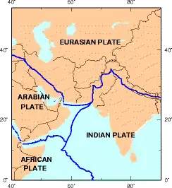 Płyta irańska od północy graniczy z płytą eurazjatycką, od południowego wschodu z płytą indyjską, od południowego zachodu z płytą arabską i od zachodu z płytą anatolijską.