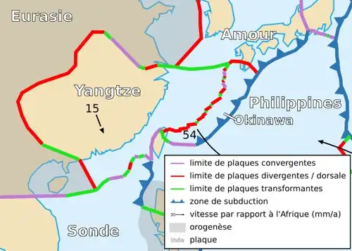 Od północnego zachodu graniczy z płytą Jangcy, od północy z płytą amurską, a od południowego wschodu i południa z filipińską.