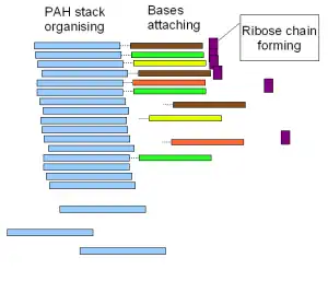 Następnie przejściowa zmiana w pH otoczenia, wzrost kwasowości mogący stanowić skutek wybuchów wulkanów uwalniających gazy takie, jak dwutlenek siarki czy dwutlenek węgla, pozwoliła zasadom odłączyć się od rusztowania z WWA z wytworzeniem cząsteczek przypominających RNA. Miejsce szkieletu rybozowo-fosforanowego dzisiejszego RNA zajmowałby szkielet z formaldehydu, odstęp pomiędzy zasadami byłby analogiczny, wynosząc 0,34 nm[1].