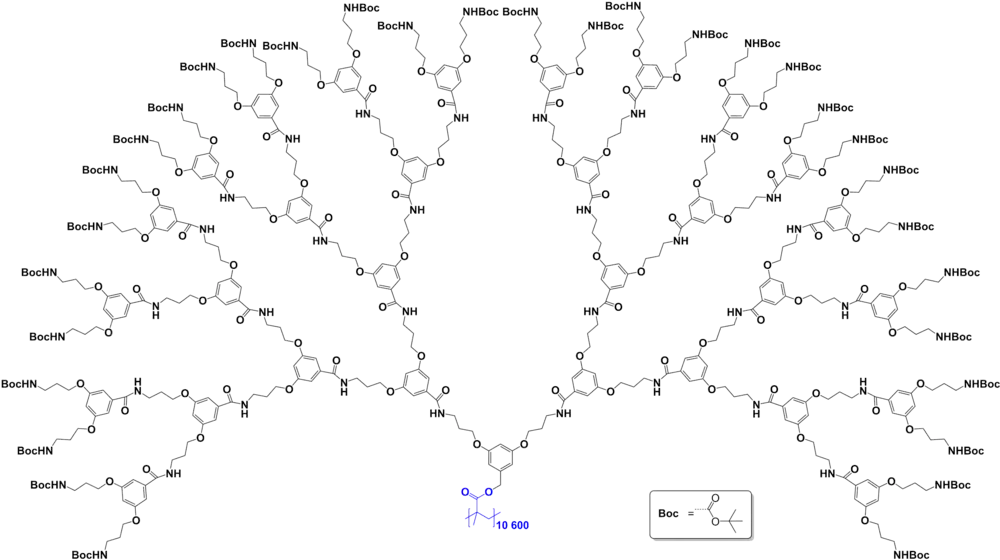 Produkt izolowano za pomocą chromatografii cieczowej na żelu krzemionkowym[4]. Uzyskany polimer składał się z ok. 10 600 reszt monomeru[1]. Następnie usuwano ochronne grupy tert-butoksykarbonylowe (Boc) i wolne grupy aminowe wykorzystywano do reakcji z sukcynimidem kwasu 3,5-bis(3-(tert-butoksykarbonylamino)propoksy)benzoesowego. Proces ten przeprowadzono łącznie czterokrotnie, uzyskując dendrymery 4. generacji, z których każdy zawierał 31 reszt 3,5-bis(3-aminopropoksy)benzoilowych[2]. W ostatnim etapie na każdej cząsteczce przebiegało jednocześnie ok. 170 tys. reakcji tworzenia wiązania amidowego. Dzięki odpowiednio dobranym warunkom reakcji proces przebiegał bardzo wydajnie i jednorodność produktu końcowego oszacowano na ponad 94%[1][2][3].