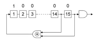 Nazywamy ją sekwencją pseudoprzypadkową, ponieważ jest ona zdeterminowana i po elementach zaczyna się ona powtarzać, co oczywiście nie występuje dla prawdziwych sekwencji przypadkowych, takich jak sekwencje generowane przez źródła radioaktywne lub szum biały.