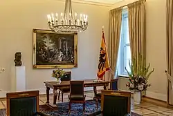 Na ścianie gabinetu za biurkiem wisi wypożyczony z muzeów Staatliche Museen zu Berlin obraz Der Weimarer Musenhof – Schiller in Tiefurt dem Hof vorlesend (pol. „Weimarski dwór muz. Schiller czyta na głos na dworze w Tiefurcie”), namalowany w 1860 roku przez Theobalda von Oera. Obok na postumencie stoi popiersie Friedricha Eberta wykonane w 1925 roku przez Georga Kolbego. Nad meblami wypoczynkowymi wisi obraz Blick von den Lößnitzhöhen auf Dresden (pol. „Widok na wzniesienia Lößnitz z Drezna”), stworzony w 1751 roku przez Johanna Alexandra Thielego, z kolei dalej na prawo od niego znajduje się obraz Am Landsee (pol. „Nad Landsee”), pochodzące z lat 1615–1655 dzieło Hermana van Swanevelta. Oba obrazy zostały wypożyczone z Galerii Obrazów Starych Mistrzów w Dreźnie[14].