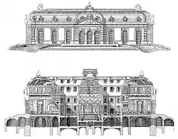 Założenie architektoniczne maison de plaisance obejmuje trzy skrzydła pałacowe: corps de logis – główną część kompleksu oraz dwa osobne skrzydła po stronie wschodniej i zachodniej (tzw. Kavalierhäuser).