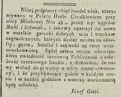 W I połowie XIX na parterze lewej oficyny pałacu mieściła się kawiarnia „Honoratka”, w której odbywały się także koncerty i popisy artystyczne[1]. Nazwa lokalu pochodziła od zdrobnienia imienia właścicielki, Honoraty Cymermanowej[1]. W 1831 było to miejsce spotkań Towarzystwa Patriotycznego. Bywali tu także: Fryderyk Chopin, Joachim Lelewel, Ksawery Bronikowski, Piotr Wysoki, Maurycy Mochnacki. W pałacu mieściła się także kaplica wyznania anglikańskiego, a następnie Konsystorz Warszawski.