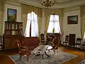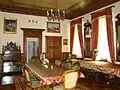 Pokój połączony jest z jadalnią poprzez masywne rozsuwane drzwi. Sufit ozdobiony jest dekoracją sztukatorską.