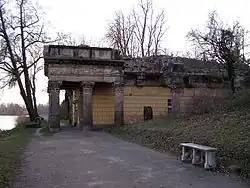Nad brzegiem jeziora rozciąga się taras z zejściem do wody. Poniżej znajduje się stylizowany na ruiny rzymskiej świątyni budynek dawnej kuchni pałacowej. Budowlę zaprojektował Carl Gotthard Langhans w latach 1788–1790. Podziemne przejście (80 m)[12] łączyło kuchnię z pałacową jadalnią letnią w Sali Grocie na parterze pałacu. W 1792 nieopodal pałacu stanęła również niewielka piramida, która skrywała piwnicę na lód. Nad wejściem do piramidy umieszczono pozłacane hieroglify, które najprawdopodobniej nawiązują do siedmiu sfer planetarnych towarzystwa różokrzyżowców, do którego od 1781 należał Fryderyk Wilhelm.