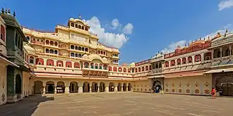- Pałac Powitań (Mubarak Mahal) – wzniesiony na polecenie maharadży królestwa Amber Madho Singha II pod koniec XIX w. z przeznaczeniem dla odwiedzających Radżastan gości dygnitarzy. Architektem był Samuel Swinton Jacob[1]. Aktualnie w budynku miesci się muzeum pałacowe,