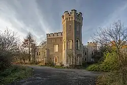 - fragment wschodniego skrzydła (obecnie opuszczona oficyna pod adresem ul. Stawowa 5) – murowany, piętrowy, w stylu neogotyku angielskiego, dwuskrzydłowy z dwoma narożnymi ośmiobocznymi wieżami, trzy i czterotraktowy z dachem pogrążonym niewidocznym za attyką z blankami[18],