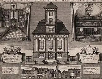 Budynek pałacowy został wzniesiony w głębi działki, a przed nim, w pierzei ulicznej, wzniesiono piętrowy dom pełniący rolę prawdopodobnie kordegardy. Jego wizerunek zachował się na rycinie Johanna Davida Schleuena. Był to dwukondygnacyjny budynek o siedmioosiowej fasadzie, z dwukondygnacyjnym dwuspadowym dachem o układzie kalenicowym, wybudowany na konstrukcji fachwerkowej pokrytej tynkiem. Artykulację fasady akcentował gzyms międzykondygnacyjny i koronujący wraz z lizenami rozdzielającymi osie okienne. W osiej środkowej znajdował się boniowany portal, nad którym znajdował się rozerwany odcinkowy tympanon. W połaci dachowej znajdowały się lukarnowe okna[1].