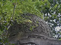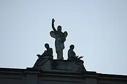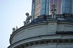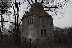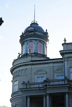 W elewacji od strony południowej obecny jest półkolisty ryzalit, otoczony partią tarasu, a ponad pierwszym piętrem przechodzący w ażurową oraz przeszkloną i zwieńczoną kopułą i iglicą wieżę[14][13][4]. Na gzymsie zwieńczającym wieżę stoi osiem figur przedstawiających amorki z instrumentami muzycznymi, owocami i kwiatami. Od strony południowej znajdował się także taras, który uległ katastrofie budowlanej[4].