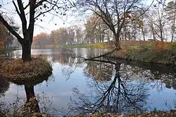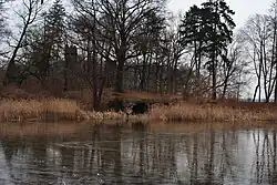 Nad jeziorem umiejscowiono przystań w formie kolumnady, a na wyspie na jeziorze umieszczono egipski obelisk[18]. W parku istniała także budowla sztucznego meczetu i miniaturowego minaretu[18][5] oraz drewniana altana i rzeźby kobiet z dziećmi[4]. Zachodnia część parku obsadzona była drzewami owocowymi, a aleje parku otoczone były żywopłotami. Po 1945 roku zniszczeniu uległy obelisk, przystań, obudowy schodów, fontanna stojąca od wschodu przy schodach. Żelazny most nad szosą został rozebrany w latach 50. XX wieku podczas przebudowy idącej pod nim drogi[4].