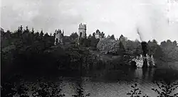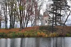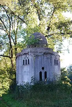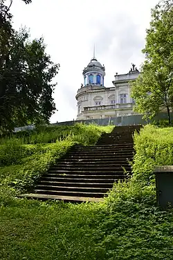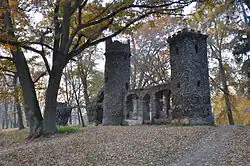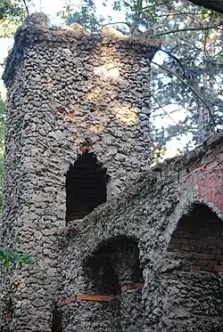 Taras ogrodowy przy pałacu połączono z parkiem północnym reprezentacyjnymi schodami, które rozpoczynały się przy położonej w parku fontannie[16]. Park położony był wokół sztucznego jeziora, otoczonego pawilonami. W parku umieszczono również sztuczne ruiny zamku, pod którym istniały podziemne tunele oraz grota, do której można było wpływać łódką. Zamek posiada trzy baszty, w których znajdowały się klatki schodowe. Baszty od wschodu połączone były ze sobą arkadowymi galeriami, a baszta zachodnia żelaznym mostem. Z baszt istniało podziemne przejście prowadzące do groty. Zamek zbudowany był z cegły i żelaza obłożonych tufem wulkanicznym sprowadzonym z Sycylii. Z tufu wykonana była także grota pod zamkiem[4].