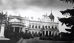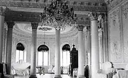 Na parterze budynku znajdowała się także połączona z ogrodem sala balowa, będąca najbardziej reprezentacyjnym pomieszczeniem pałacu. Sala podzielona była na mniejsze przestrzenie kolumnami o kompozytowych kapitelach[4]. Środkowa przestrzeń sali zwieńczona była plafonem przedstawiającym taniec cherubinów. Ściany udekorowano kimationami, fryzami tryglifowo–metopowymi, palmetami, belkowaniem oraz ornamentami okuciowymi i kandelabrowymi[4].
