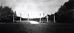 Brama główna rezydencji została umieszczona przy skrzyżowaniu szosy kaliskiej z warszawską, do budynku pałacu prowadził reprezentacyjny podjazd udekorowanego obeliskami z popiersiami generała Cypriana von Kreutza i hrabiego Aleksandra Cypriana[17][4], zakończonego małym rondem z rzeźbami i dekoracjami kwiatowymi[16].