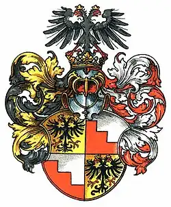 Od frontu w ryzalicie, między oknami na drugim piętrze kartusz z tarczą zawierającą inicjały F. W. (Friedrich von Wichelhaus) i rok 1869 oraz tarczę z herbem von Wichelhaus.