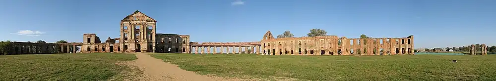 Pałac na początku XX wieku- Ruiny korpusu głównego pałacu (bez sklepień) z mocno wysuniętym ryzalitem ozdobionym dwiema parami doryckich kolumn na potężnych cokołach, pilastrami i trójkątnym frontonem