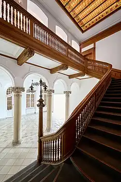 Wnętrza kamienicy przed remontem w XX wieku miały układ trzytraktowy o trzech osiach wnętrz. Od strony zachodniej znajdowała się sień przelotowa z wewnętrznymi, wyrównującymi ceglanymi schodami prowadzącymi na wysoki parter oblicowanym białym marmurem. Na parterze, w trakcie środkowym, znajdował się rozległy hol oświetlony przez witraż w dachu i z trzybiegowymi drewnianymi schodami na belkach stalowych prowadzących na piętro[3][6]. Z tyłu budynku znajdował się taras z podwójnymi schodami na podwórze[3]. Nad sienią znajdowało się sklepienie kolebkowe ceglane, a nad częścią holu sklepienie kolebkowe z lunetami[3].